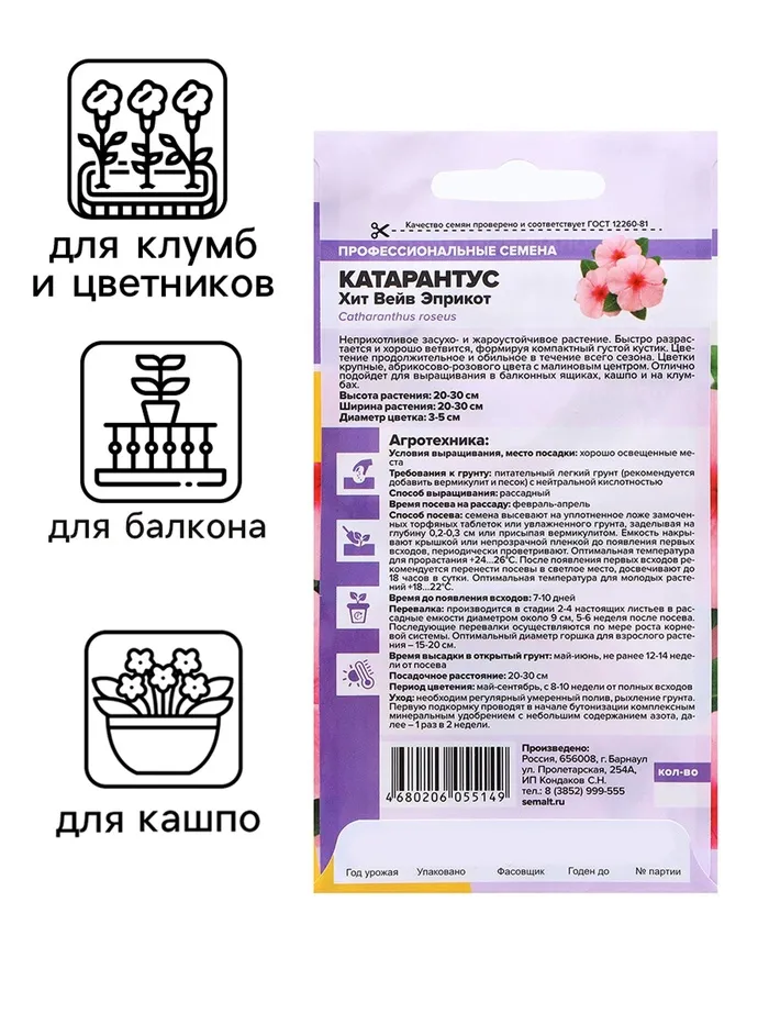 Семена Катарантус "Хит Вейв Эприкот", ц/п, 5 шт — Характеристики