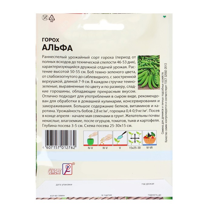 Для посева семян гороха наиболее благоприятны ранние сроки ( конец апреля ― начало мая ), при этом растения меньше повреждаются мучнистой росой и не так страдают от засухи. Чтобы ускорить появление всходов, перед посевом семена замачивают в воде на 12 часов. Высевают горох рядами, 30-50 см между рядами и 8-15 см между гнездами посева. Для защиты от птиц над посевами натягивают сетку. Всходы появляются на 7-8-й день. Размещать горох лучше на участках с окультуренными и удобренными, некислыми, лёгкими почвами. Для хорошего роста требует влажной почвы. Уход заключается в рыхлении почвы и борьбе с сорняками; в сухое время посевы обильно поливают. Убирают многократно, по мере созревания бобов; лучшее время для сборов - раннее утро. Чтобы урожай поступал продолжительное время, посев проводят в несколько сроков.