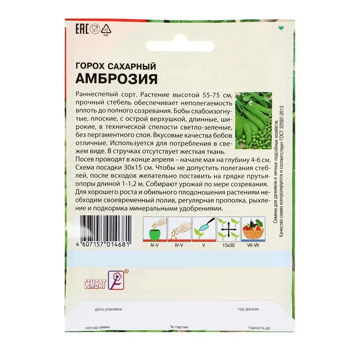 Посев производят ранней весной на солнечной стороне участка на глубину 4-6 см. Схема посева: 15x30 см. Растения нуждаются в опоре. Посев производиться многократно с конца апреля до конца июня. Интервал посева – 7-10 дней. Посев производят в плодородную почву на глубину 2-3 сантиметра.