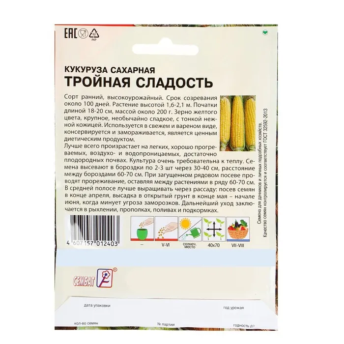 В средней полосе лучше выращивать через рассаду: посев семян на рассаду в конце апреля, высадка в открытый грунт в конце мая – начале июня, когда минует угроза заморозков. Выращивают посевом в открытый грунт в мае, по схеме 45х45 см. Семена перед посадкой замачивают на сутки в воде. Посев в открытый грунт, когда минует угроза возвратных заморозков, при прогревании почвы до + 12°С. Глубина заделки семян до 5 см. Хорошо растет на легких, плодородных, прогреваемых почвах, не растет на кислых и заболоченных. Уход: прополка, рыхление, окучивание перед образованием метелок. Полив по мере необходимости. Хорошо отзывается на внесение органического или полного минерального удобрения до посева. Сахарную кукурузу рекомендуется выращивать отдельно от других сортов, так как перекрестное опыление снижает сладость зерен. Уборку початков проводят в фазе молочной спелости.