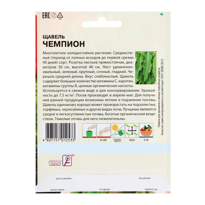 Многолетнее, холодостойкое растение. Среднеспелым (период от полных всходов до первой срезки 40 днем) сорт. Розетка листьев прямостоячая, диаметром 30 см, высотой 40 см. Лист удлиненно-овальный, зеленый, крупный, сочный, гладкий. Черешок средней длины. Вкус слабокислый. Щавель содержит большое количество витамина С, каротин, витамины группы В, ценные органические кислоты. Используется в свежем виде и для консервирования. Урожайность до 7,5 кг/м2.