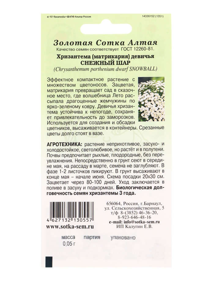 Семена Хризантема девичья «Снежный шар», 0.05 г, белая, махровая, «Золотая Сотка Алтая» — Характеристики