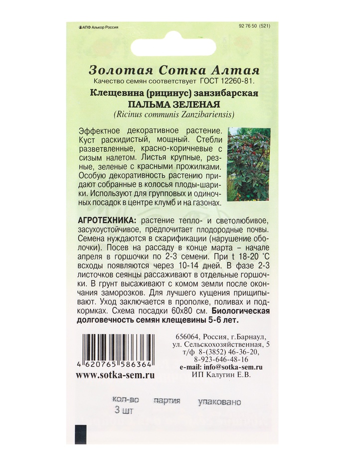Семена Клещевина занзибарская «Пальма зеленая», 3 шт., «Золотая Сотка Алтая» — Характеристики