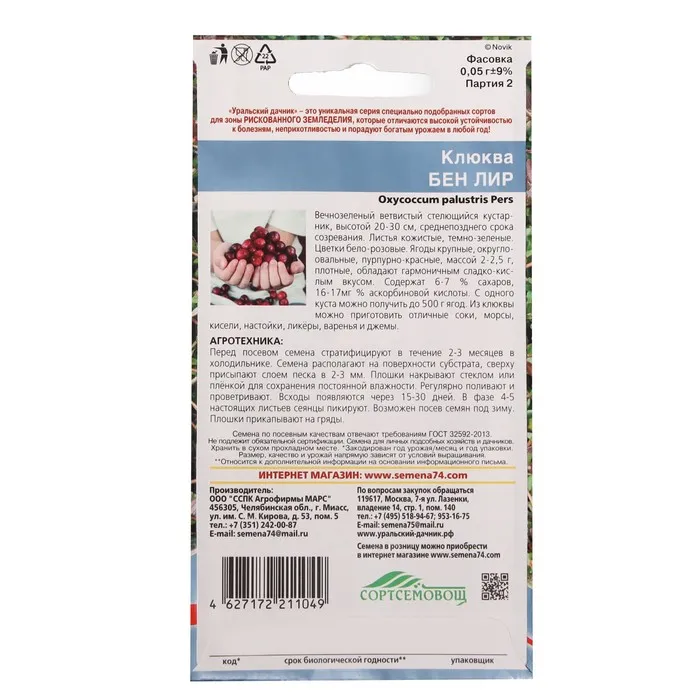 Вечнозеленый ветвистый стелющийся кустарник, высотой 20-30 см, среднепозднего срока созревания. Листья кожистые, темно-зеленые. Цветки бело-розовые. Ягоды крупные, округлоовальные, пурпурно-красные, массой 2-2,5 г, плотные, обладают гармоничным сладко-кислым вкусом. Содержат 6-7 % сахаров, 16-17мг % аскорбиновой кислоты. С одного куста можно получить до 500 г ягод. Из клюквы можно приготовить отличные соки, морсы, кисели, настойки, ликёры, варенья и джемы.