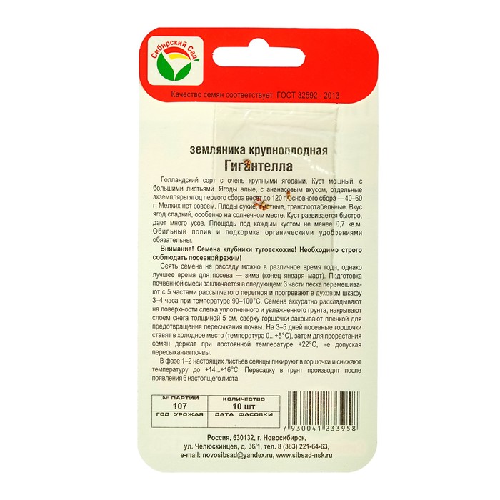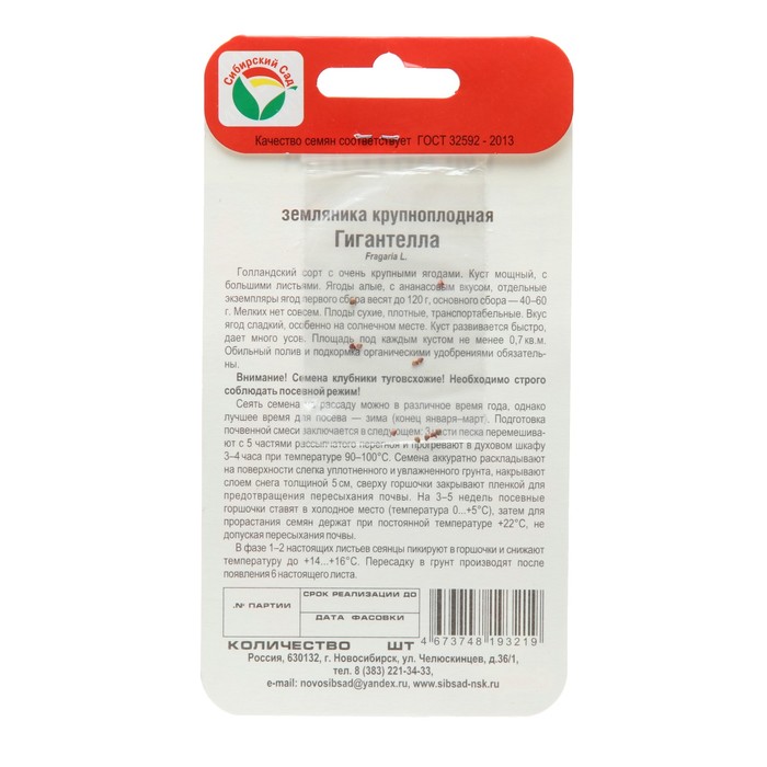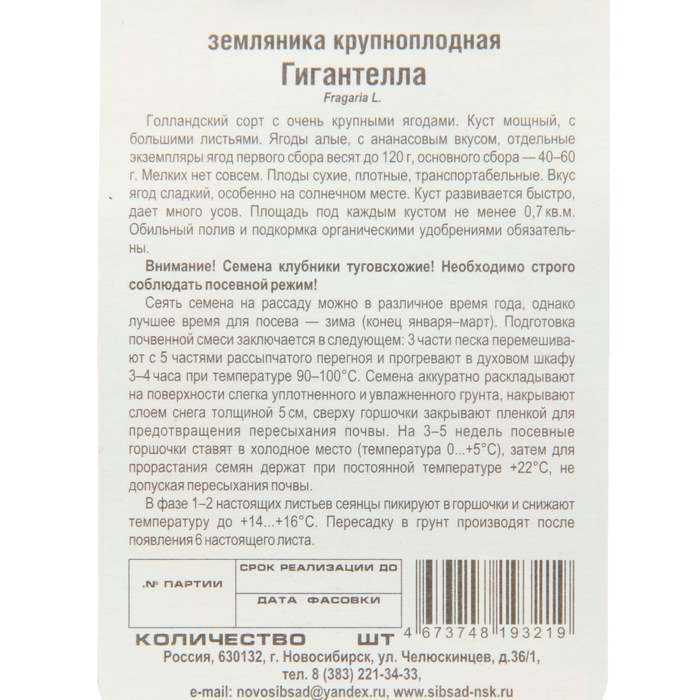 Голландский сорт с очень крупными ягодами.Куст мощный, с большими листьями. Ягоды алые, с ананасовым вкусом, отдельные экземпляры ягод первого сбора весят до 120 г, основного сбора — 40-60 г. Мелких нет совсем. Плоды сухие, плотные, транспортабельные. Вкус ягод сладкий, особенно на солнечном месте. Куст развивается быстро, дает много усов. Площадь под каждым кустом не менее 0,7 кв. м. Обильный полив и подкормка органическими удобрениями обязательны.Внимание! Семена клубники туговсхожие! Необходимо строго соблюдать посевной режим! Всходы чаще всего появляются неравномерно в течение 30-40 дней (до 60 дней).Сеять семена на рассаду можно в различное время года, однако лучшее время для посева - зима (конец января - март). Подготовка почвенной смеси заключается в следующем: 3 части песка перемешивают с 5 частями рассыпчатого перегноя и прогревают в духовом шкафу 3-4 часа при температуре 90-100°С. Семена аккуратно раскладывают на поверхности слегка уплотненного и увлажненного грунта, накрывают слоем снега толщиной 5 см, сверху горшочки закрывают пленкой для предотвращения пересыхания почвы. На 3-5 дней посевные горшочки ставят в холодное место (температура 0...+5°C), затем для прорастания семена держат при постоянной температуре +22°С, не допуская пересыхания почвы.В фазе 1 -2 настоящих листьев сеянцы пикируют в горшочки и снижают температуру до +14...+16°С. Пересадку в грунт производят после появления 6-го настоящего листа.