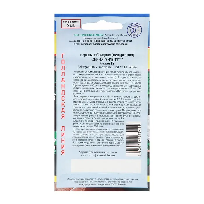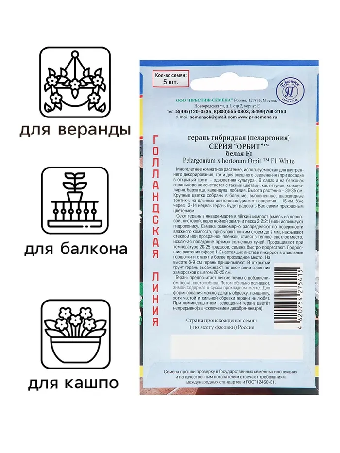 Семена комнатных цветов Герань "Белая", F1, 5 шт. — Характеристики