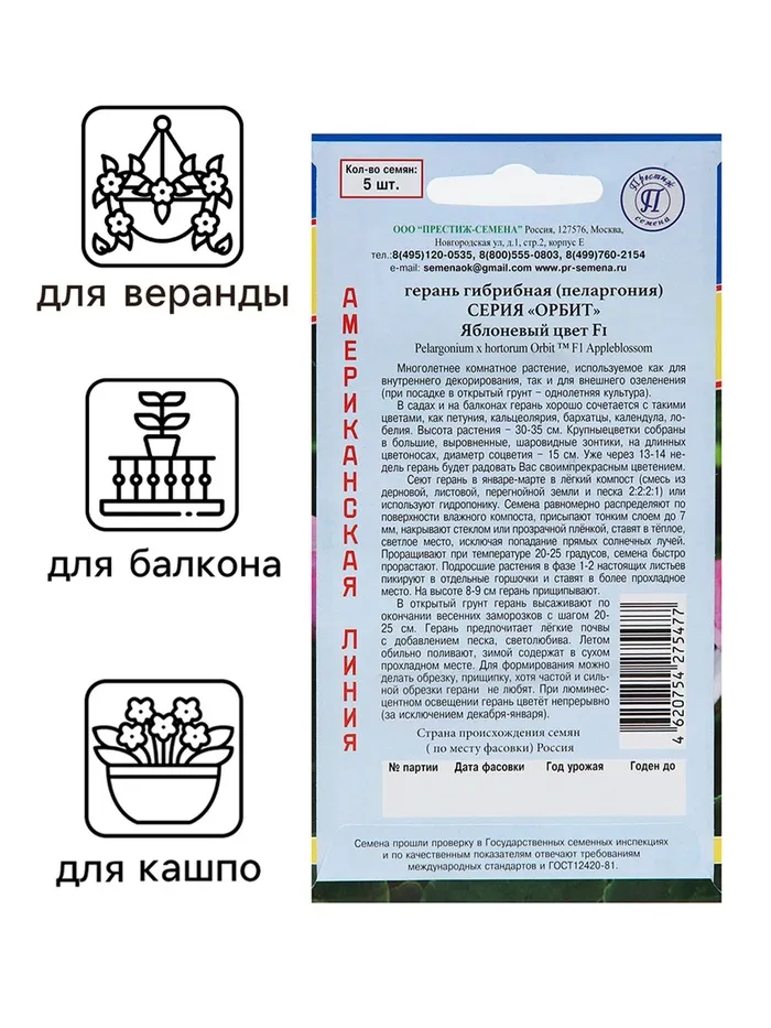 Семена комнатных цветов Герань "Яблоневый цвет", F1, 5 шт. — Характеристики