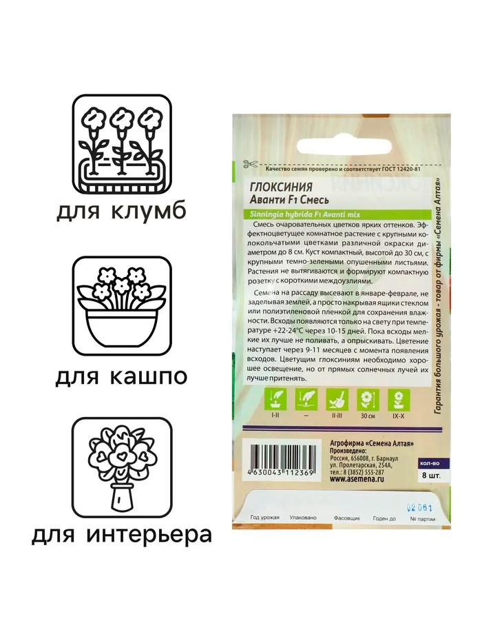 Смесь очаровательных цветков ярких оттенков. Эффектноцветущее комнатное растение с крупными колокольчатыми цветками различной окраски диаметром до 8 см. Куст компактный высотой до 30 см., с крупными темно-зелеными опушенными листьями. Растения не вытягиваются и формируют компактную розетку с короткими междоузлиями.