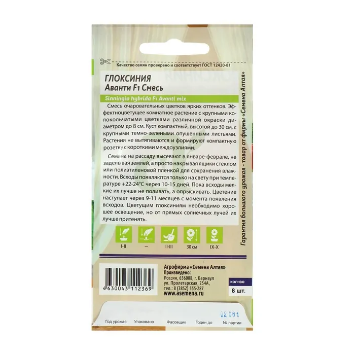 Семена на рассаду сеют в январе-феврале, не заделывая землей, а просто накрывая ящики стеклом или полиэтиленовой пленкой для сохранения влажности. Всходы появляются только на свету при температуре 22-24°С через 10-15 дней. Пока всходы мелкие, их лучше не поливать, а опрыскивать. Цветение наступает через 9-11 месяцев с момента появления всходов. Цветущим глоксиниям необходимо хорошее освещение, но от прямых солнечных лучей их лучше притенять.