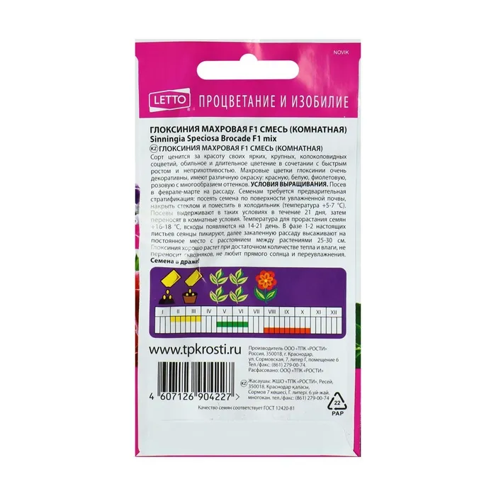 Условия выращивания:посев в феврале - марте на рассаду.Семенам требуется предварительная стратификация:посеять семенами по поверхности увлажненной почвы,накрыть стеклом и поместить в холодильник (температура +5+7°С).Посевы выдерживают в таких условиях в течение 21 дня, затем переносят в комнатные условия.Температура прорастания семян +16+18°С, всходы появляются на 14-21 деньВ фазе 1-2 настоящих листьев сеянцы пикируют, далее закаленную рассаду высаживают на постоянное место на расстоянии 25-30 см.Глоксиния хорошо растет при достаточном количестве тепла и влаги, не переносит сквозняков, не любит прямого солнца и переувлажнения.