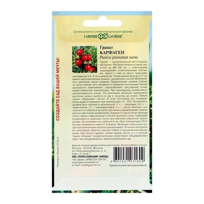 Гранат — листопадный субропический кустарник. Растение неприхотливое, высотой до 60-100 см, с небольшими изумрудными эллиптическими листями. Цветет с мая по август красными цветками до 2,5-4 см в диаметре. Плоды диаметром до 5-7 см имеют многочисленные семена, окруженные сочной облолочкой. Сок приятный, кисло-сладкий.