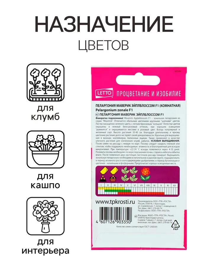 Семена комнатных цветов Пеларгония "Эйплблоссом", 4 шт. — Характеристики