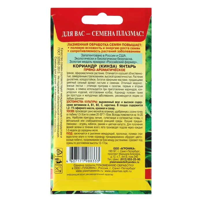 Кориандр (кинза) Янтарь — среднеспелый сорт. От всходов до созревания семян проходит 95‒100 дней. Высота растений составляет 40‒50 см. Сорт отличается пластичностью, приспособлен к различным почвенно-климатическим условиям. Холодостойкий, засухоустойчивый, хороший медонос.