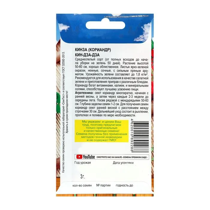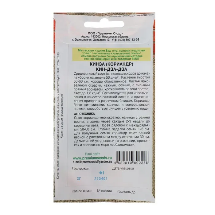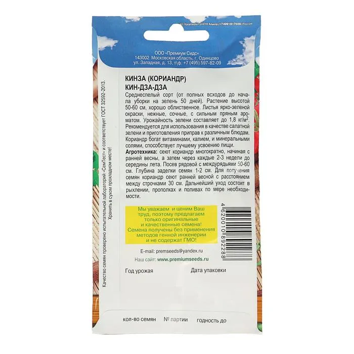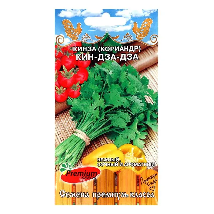 Среднеспелый сорт (от полных всходов до начала уборки на зелень 50 дней). Растение высотой 50-60 см, хорошо облиственное. Листья ярко- зеленой окраски, нежные, сочные, с сильным пряным ароматом. Урожайность зелени составляет до 1,8 кг/м2. Рекомендуется для использования в качестве салатной зелени и приготовления приправ к различным блюдам. Кориандр богат витаминами, калием, и минеральными солями, способствует лучшему усвоению пищи.