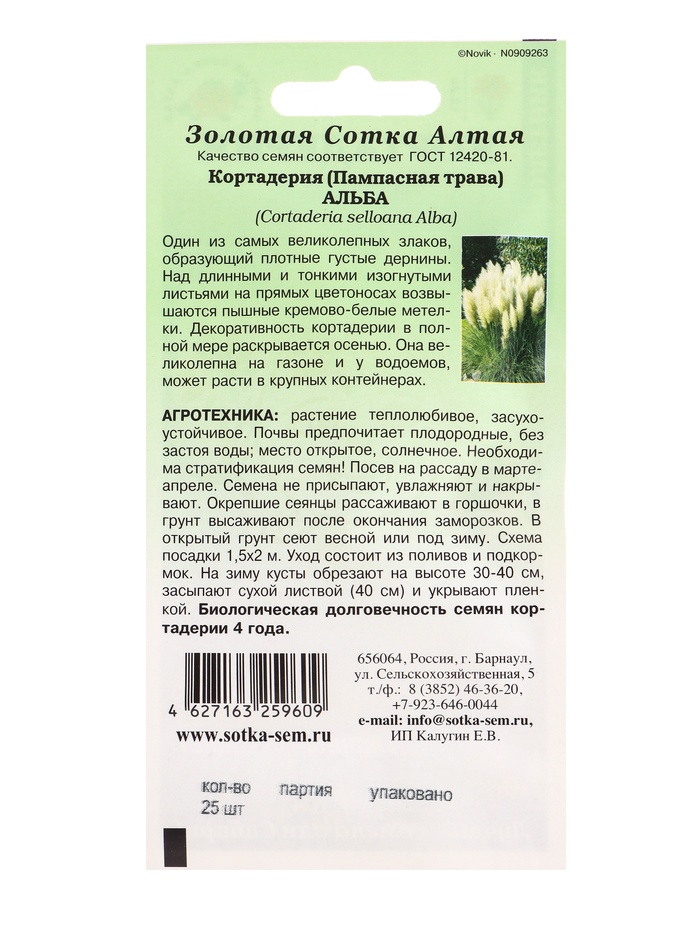 Семена Кортадерия «Альба», 25 шт., многолетняя, «Золотая Сотка Алтая» — Характеристики