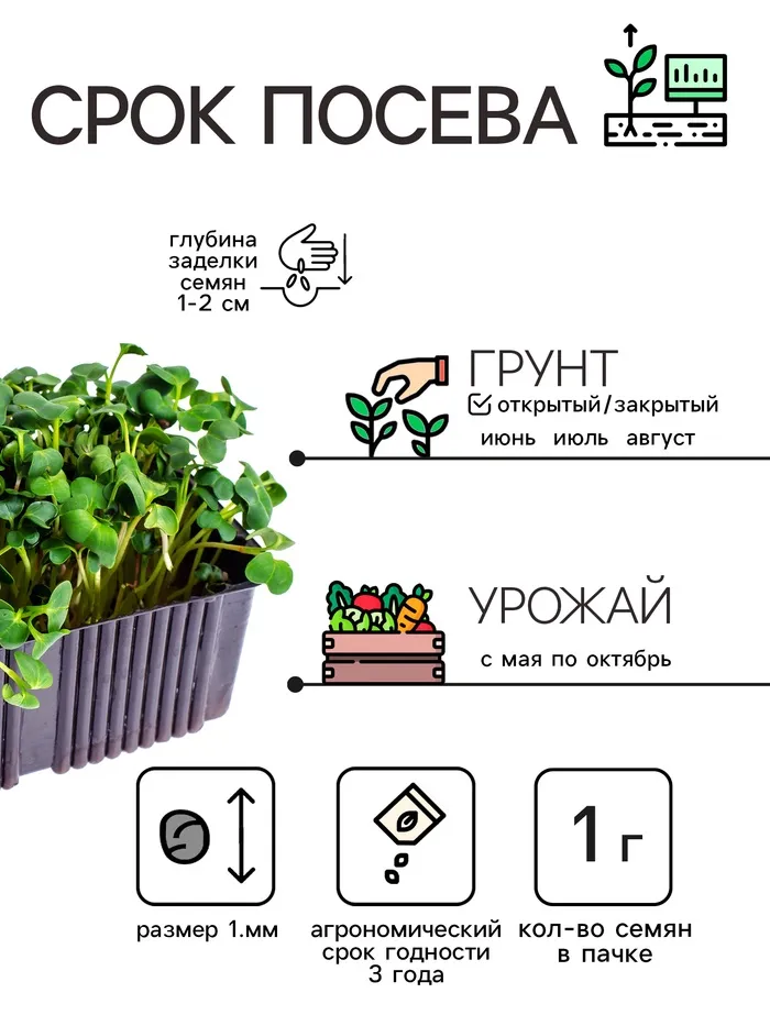 Быстрый срок созревания — всего 10–12 дней, что позволяет наслаждаться свежей зеленью практически сразу;