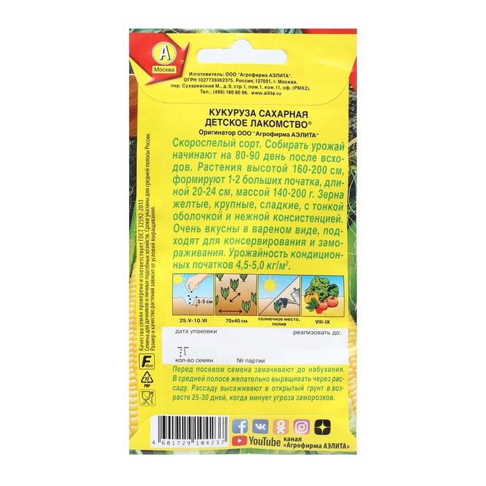 Новый, раннеспелый сорт. Период от всходов до технической спелости 80-90 дней. Растения высотой 160-200 см, формируют в среднем по 4 початка. Початки цилиндрические, длиной 20-22 см, массой 240-270 г. Зерна крупные, сладкие, с тонкой оболочкой и нежной консистенцией. Очень вкусны в вареном виде, подходят для консервирования и замораживания. Урожайность – 4,5-5,0 кг/м2. Перед посевом семена замачивают до набухания.