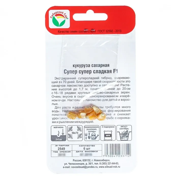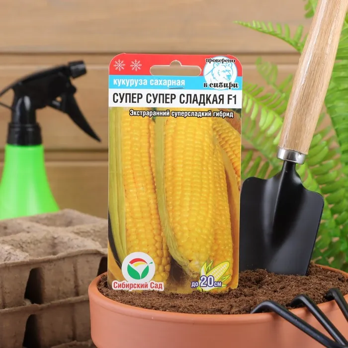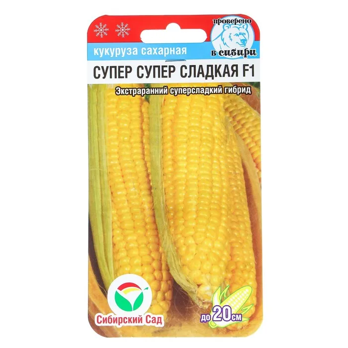 Экстраранний суперсладкий гибрид, созревающий за 70 дней. Благодаря такой скороспелости это сахарное лакомство доступно и северянам! Растение высотой до 1,7 м, початки длиной до 20 см с 16-18 рядами крупных медово-сахарных зерен. Очень вкусна в сыром, консервированном и варёном виде. Настоящее лакомство для детей и взрослых.