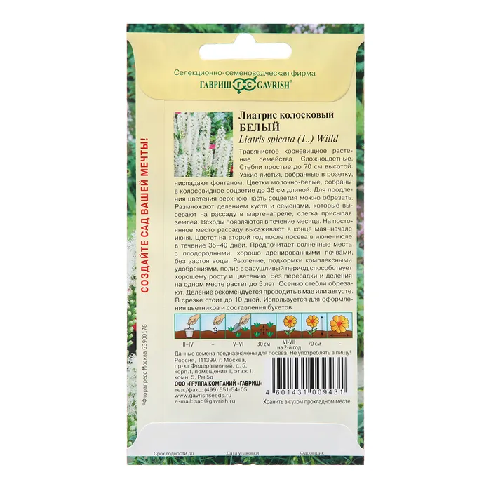 Травянистое корневищное растение семейства Сложноцветные. Стебли простые до 50 см высотой. Узкие листья, собранные в розетку ниспадают фонтаном. Цветки красно-фиолетовые, собраны в колосовидное соцветие до 35 см длиной. Цветет в июне-июле 35-40 дней. Хорошо растет в солнечном, теплом или жарком месте. Почва умеренно сухая, рыхлая, богатая питательными веществами. На тяжелых, сырых почвах растение гниет. Размножают делением куста и семенами. Сеянцы зацветают на второй год. Лиатрис имеет клубневидные корневища, которые можно легко поделить. Деление рекомендуется проводить каждые 3 года в мае или августе.