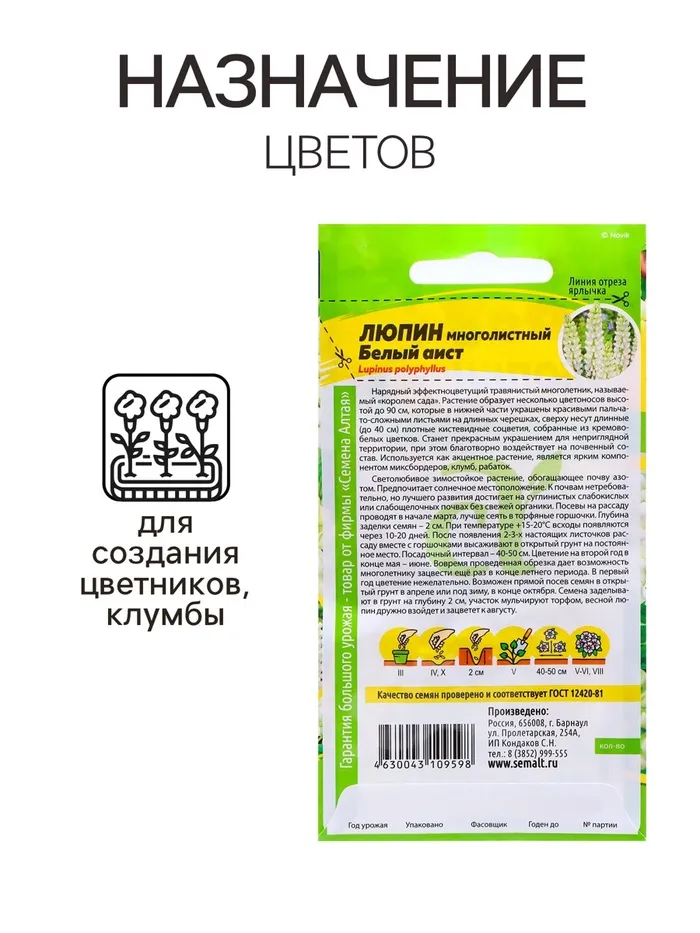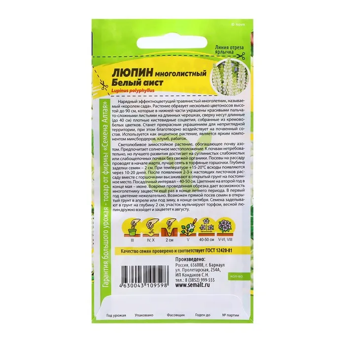 Нарядный эффектноцветущий травянистый многолетник, называемый «королем сада». Растение образует несколько цветоносов высотой до 90 см, которые в нижней части украшены красивыми пальчато-сложными листьями на длинных черешках, сверху несут длинные (до 40 см) плотные кистевидные соцветия, собранные из кремово-белых цветков. Станет прекрасным украшением для неприглядной территории, при этом благотворно воздействует на почвенный состав. Используется как акцентное растение, является ярким компонентом миксбордеров, клумб, рабаток. Светолюбивое зимостойкое растение, обогащающее почву азотом. Предпочитает солнечное местоположение. К почвам нетребовательно, но лучшего развития достигает на суглинистых слабокислых или слабощелочных почвах без свежей органики. Посевы на рассаду проводят в начале марта, лучше сеять в торфяные горшочки. Глубина заделки семян – 2 см. При температуре +15-20°С всходы появляются через 10-20 дней. После появления 2-3-х настоящих листочков рассаду вместе с горшочками высаживают в открытый грунт на постоянное место. Посадочный интервал – 40-50 см. Цветение на второй год в конце мая – июне. Вовремя проведённая обрезка даёт возможность многолетнику зацвести ещё раз в конце летнего периода. В первый год цветение нежелательно. Возможен прямой посев семян в открытый грунт в апреле или под зиму, в конце октября. Семена заделывают в грунт на глубину 2 см, участок мульчируют торфом, весной люпин дружно взойдет и зацветет к августу.