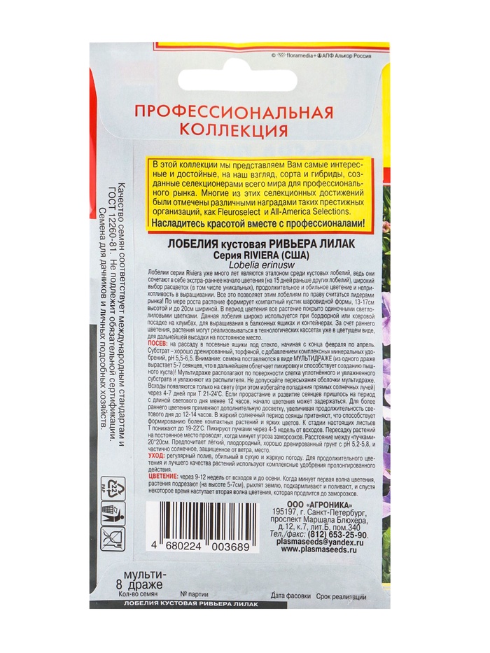 Лобелии серии Riviera уже много лет являются эталоном среди кустовых лобелий, ведь они сочетают в себе экстра-раннее начало цветения (на 15 дней раньше других лобелий), широкий выбор расцветок (в том числе уникальных), продолжительное и обильное цветение и неприхотливость в выращивании. Все это позволяет этим лобелиям по праву считаться лидерами рынка! По мере роста растение формирует компактный кустик шаровидной формы, 13-17см высотой и до 20см шириной. В период цветения все растение покрыто одиночными светло-лиловыми цветками. Данная лобелия широко используется при бордюрной или ковровой посадке на клумбах, для выращивания в балконных ящиках и контейнерах. За счет раннего цветения, растения могут реализовываться в технологических кассетах уже в цветущем виде, для дальнейшей высадки на постоянное место.