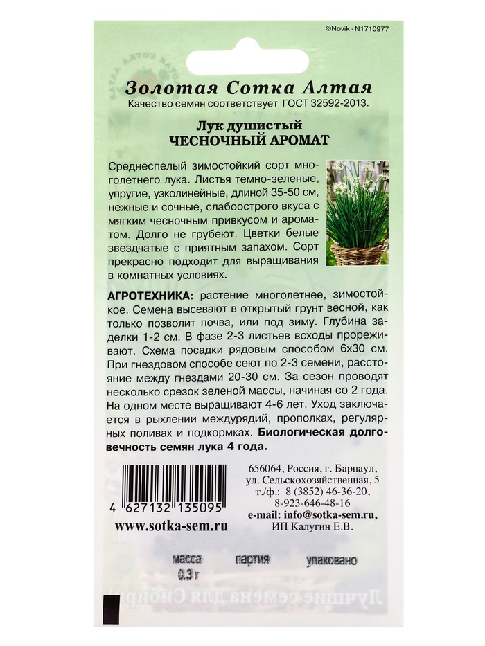 Семена Лук душистый «Чесночный аромат», 0.3 г, среднеспелый, «Золотая Сотка Алтая» — Характеристики