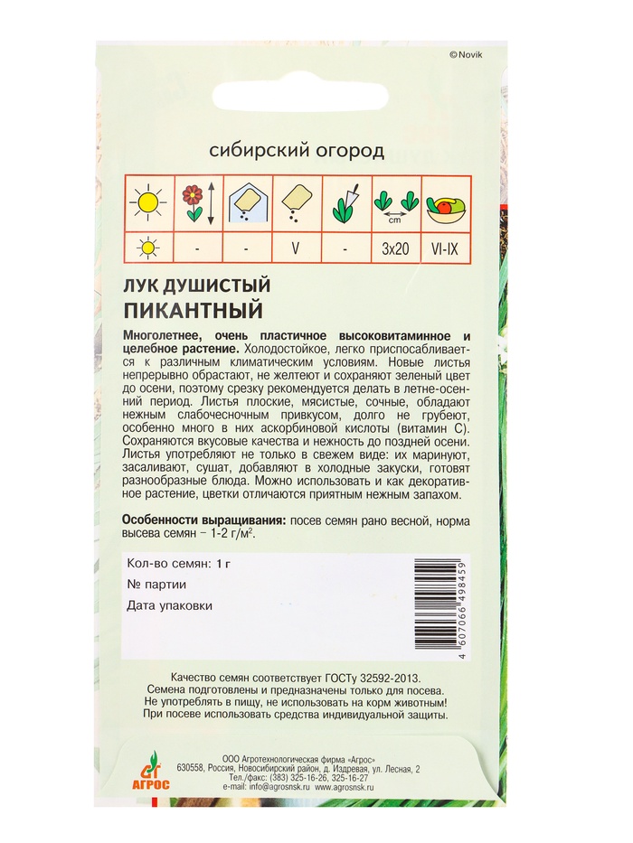 Семена Лук душистый «Пикантный», 1 г, «Агрос» — Характеристики