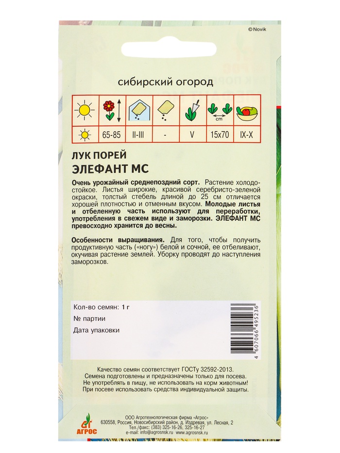 Семена Лук порей «Элефант МС», 1 г, «Агрос» — Характеристики
