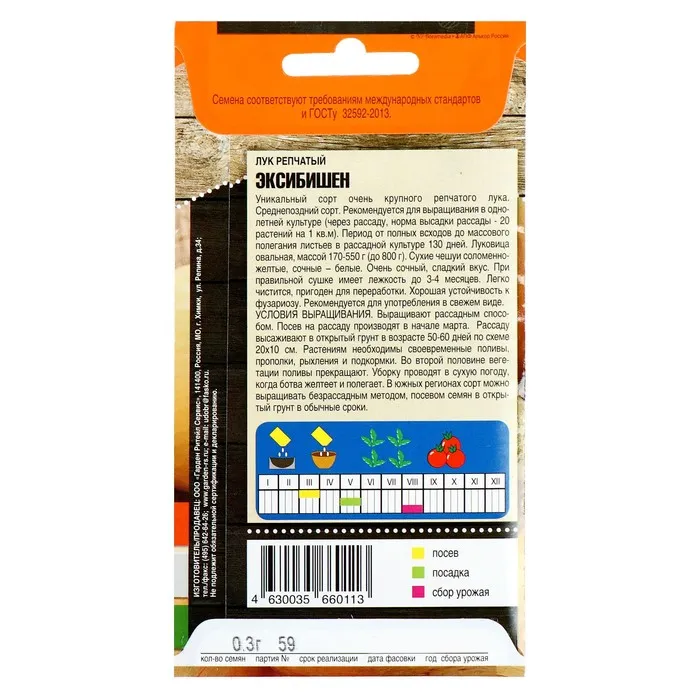 Позднеспелый (100 дней от всходов до массового полегания и пожелтения листьев), сладкий салатный сорт. Выращивают в однолетней культуре через рассаду. Срок формирования луковицы 5-5,5 недель. Посев на рассаду в марте, высадка рассады в открытый грунт в мае, через 7-10 см. Луковицы большого размера, до 600 г, округло вытянутой формы с нежным вкусом. Чешуя золотистая, высокого качества, мягкая. При безрассадном посеве в апреле в открытый грунт масса луковицы до 150 г. Схема посадки 5-7x10-15 см. Урожайность лука-репки 6,0 кг/м2. Рекомендуется для потребления в свежем виде и приготовления салатов.