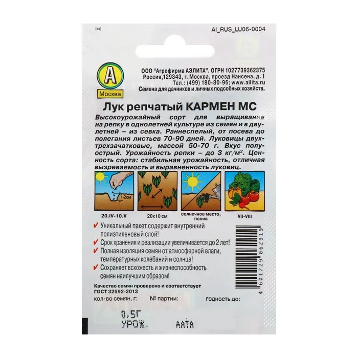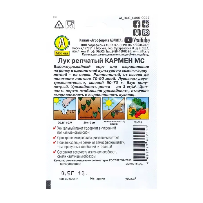 Семена Лук репчатый "Кармен МС" "Лидер", Дв, 0,5 г , — Характеристики