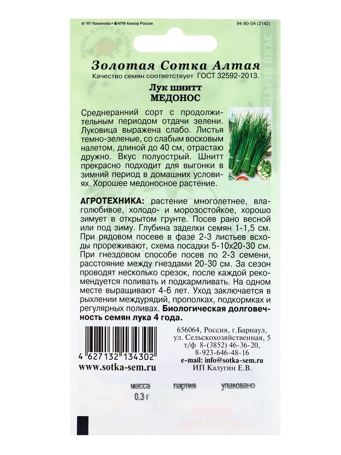 Семена Лук «Шнитт Медонос», 0.3 г, «Золотая Сотка Алтая» — Характеристики