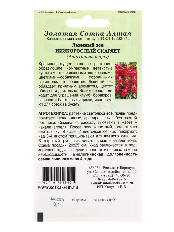 Семена Львиный зев низкорослый «Скарлет», 0.1 г, «Золотая Сотка Алтая» — Характеристики