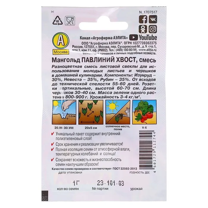 Благодаря внутреннему полиэтиленовому слою пакет не пропускает влагу и увеличивает срок годности семян до 2 лет.