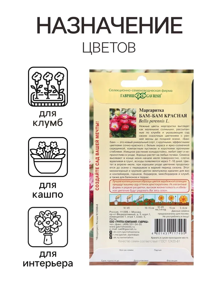 Семена Маргаритка "Бам-бам", ц/п, красная, 7 шт — Характеристики
