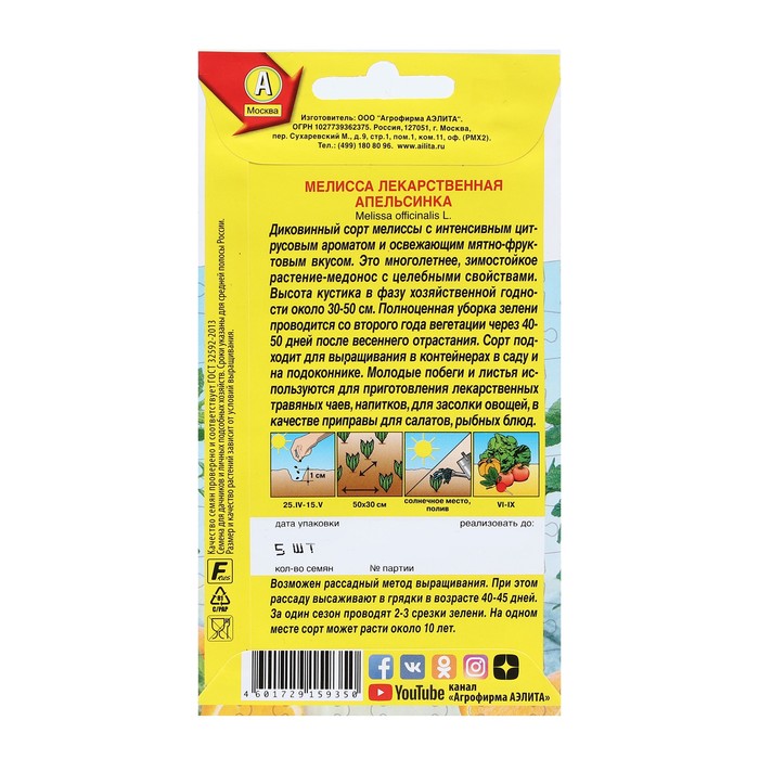 Диковинный сорт мелиссы с интенсивным цитрусовым ароматом и освежающим мятно-фруктовым вкусом. Это многолетнее, зимостойкое растение-медонос с целебными свойствами. Высота кустика в фазу хозяйственной годности около 30-50 см. Полноценная уборка зелени проводится со второго года вегетации через 40- 50 дней после весеннего отрастания. Сорт подходит для выращивания в контейнерах в саду и на подоконнике. Молодые побеги и листья используются для приготовления лекарственных травяных чаев, напитков, для засолки овощей, в качестве приправы для салатов, рыбных блюд.