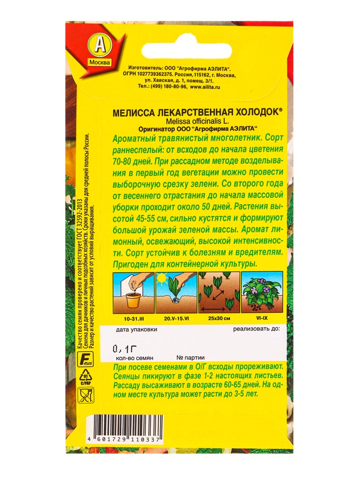 Семена Мелисса лекарственная «Холодок», 0.1 г, многолетник, «Аэлита» — Характеристики