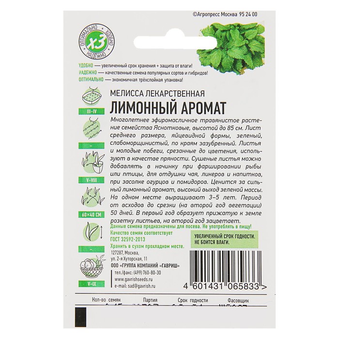 Многолетнее эфиромасличное травянистое растение семейства Яснотковые высотой до 85 см. Лист среднего размера, яйцевидной формы, зеленый, слабоморщинистый, по краям зазубренный. Листья и молодые побеги, срезанные до цветения, используют в качестве пряности. Сушеные листья можно добавлять в начинку при фаршировании рыбы или птицы, для отдушки чая, ликёров и напитков, при засолке огурцов и помидоров. Ценится за сильный лимонный аромат, высокий выход зеленой массы. На одном месте выращивают 3-5 лет. Период от всходов до срезки (на второй год вегетации) 50 дней. В первый год образует прижатую к земле розетку листьев, на второй год зацветает.