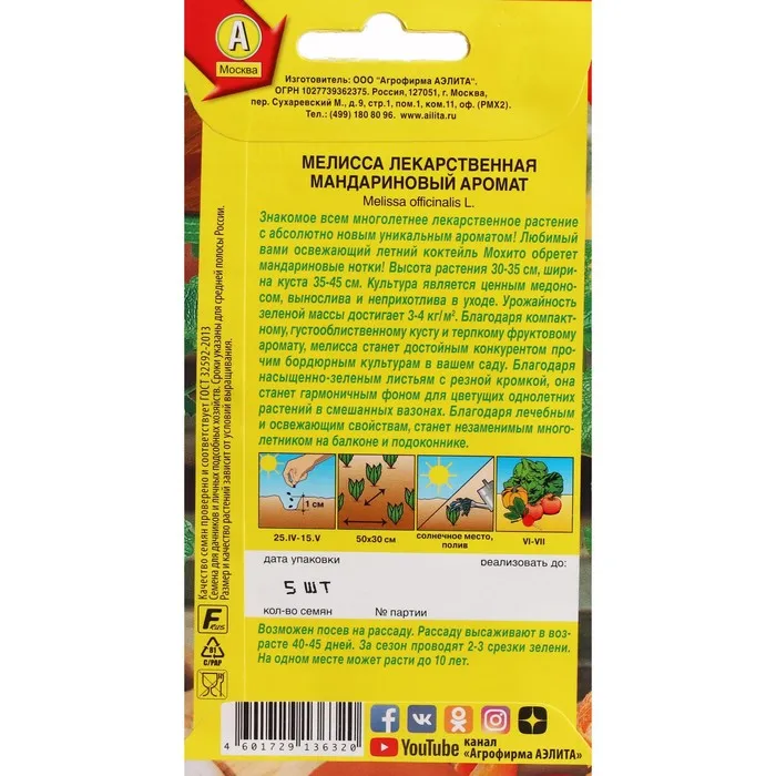 Знакомое всем многолетнее лекарственное растение с абсолютно новым уникальным ароматом! Любимый Вами освежающий летний коктейль Мохито обретет мандариновые нотки! Высота растения 3035 см, ширина куста 35-45 см. Культура является ценным медоносом, вынослива и неприхотлива в уходе. Урожайность зеленой массы достигает 3-4 кг/м2. Благодаря компактному, густооблиственному кусту и терпкому фруктовому аромату, мелисса станет достойным конкурентом прочим бордюрным культурам в Вашем саду. Благодаря насыщенно-зеленым листьям с резной кромкой, она станет гармоничным фоном для цветущих однолетних растений в смешанных вазонах. Благодаря лечебным и освежающим свойствам, станет незаменимым многолетником на балконе и подоконнике.