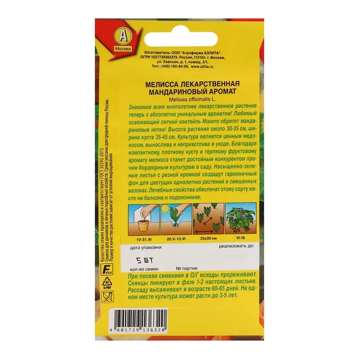Знакомое всем многолетнее лекарственное растение с абсолютно новым уникальным ароматом! Любимый Вами освежающий летний коктейль Мохито обретет мандариновые нотки! Высота растения 3035 см, ширина куста 35-45 см. Культура является ценным медоносом, вынослива и неприхотлива в уходе. Урожайность зеленой массы достигает 3-4 кгм2. Благодаря компактному, густооблиственному кусту и терпкому фруктовому аромату, мелисса станет достойным конкурентом прочим бордюрным культурам в Вашем саду. Благодаря насыщенно-зеленым листьям с резной кромкой, она станет гармоничным фоном для цветущих однолетних растений в смешанных вазонах. Благодаря лечебным и освежающим свойствам, станет незаменимым многолетником на балконе и подоконнике.