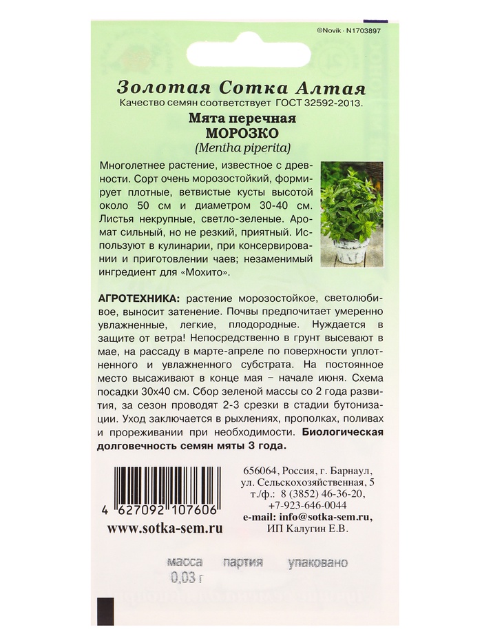 Семена Мята перечная «Морозко», 0.03 г, многолетняя, «Золотая Сотка Алтая» — Характеристики