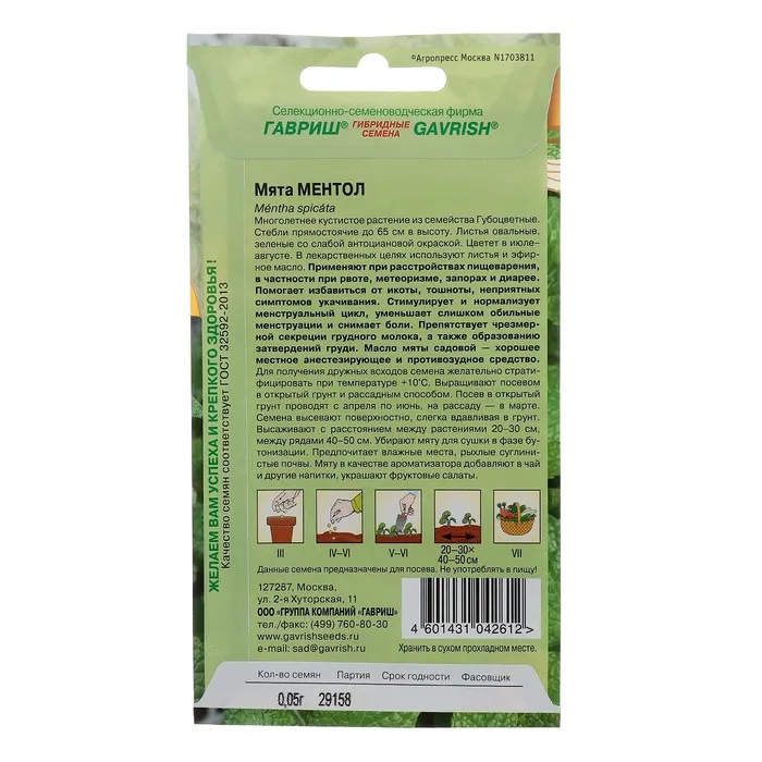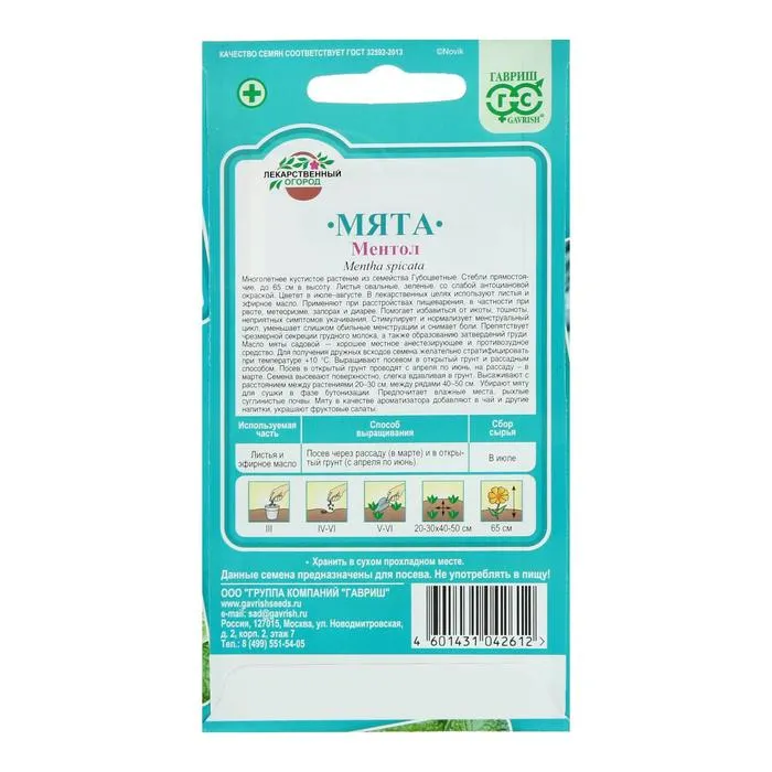 Посев проводят в открытый грунт с апреля по июнь, на рассаду — в марте. Высаживают с расстоянием между растениями 20–30 см, между рядами — 40–50 см. Для сушки мяту убирают в фазе бутонизации. Растение предпочитает влажные места, рыхлые суглинистые почвы. Мяту в качестве ароматизатора добавляют в чай и другие напитки. Её листьями украшают фруктовые салаты.
