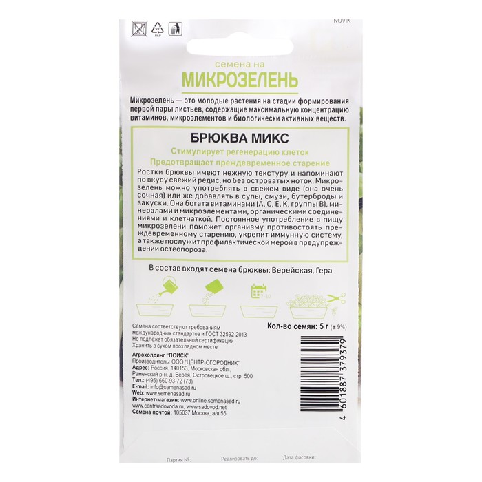 Микрозелень «Брюква» — источник витаминов (А, С, Е, группы В), богата органическими соединениями, минералами и клетчаткой. Нежные ростки обладают приятным вкусом, напоминающим редис, но без острых ноток. Пригодны для употребления в свежем виде или в качестве витаминной добавки к супам, салатам. Срезка зелени (на стадии формирования первых двух листов) производится на 7-10 день после посева семян.