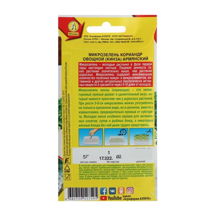 Семена Микрозелень Кинза, 5 г — Характеристики