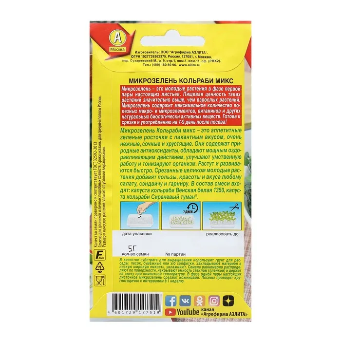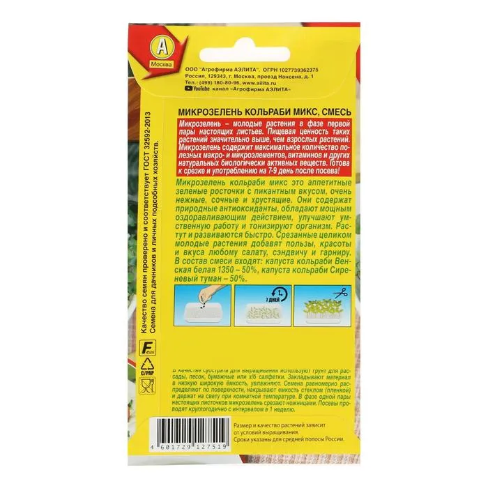 В состав смеси входят: капуста кольраби Венская белая 1350 – 50%, капуста кольраби Сиреневый туман – 50%. В качестве субстрата для выращивания используют грунт для рассады, песок, бумажные или х/б салфетки. Закладывают материал в низкую широкую ёмкость, увлажняют. Семена равномерно распределяют по поверхности, накрывают емкость стеклом (пленкой) и держат на свету при комнатной температуре. В фазе одной пары настоящих листочков микрозелень срезают ножницами. Посевы проводят круглогодично с интервалом в 1 неделю.