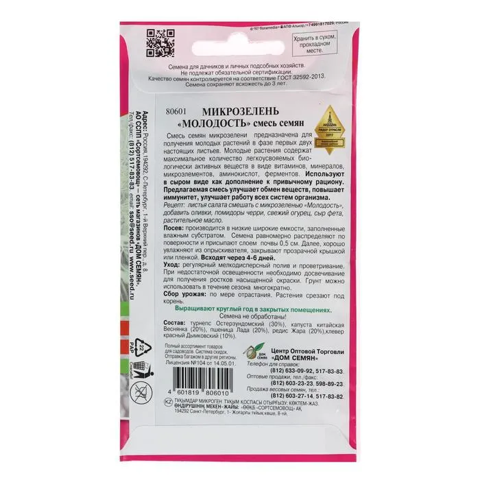 Смесь семян «микрозелень» предназначена для получения молодых растений в фазе первых двух настоящих листьев. Молодые растения содержат максимальное количество легкоусвояемых биологически активных веществ в виде витаминов, минералов, микроэлементов, аминокислот, ферментов. Используют в сыром виде как дополнение к привычному рациону. Предлагаемая смесь улучшает обмен веществ, повышает иммунитет, улучшает работу всех систем организма. Рецепт: листья салата смешать с микрозеленью «Молодость», добавить оливки, помидоры черри, свежий огурец, сыр фета, растительное масло.