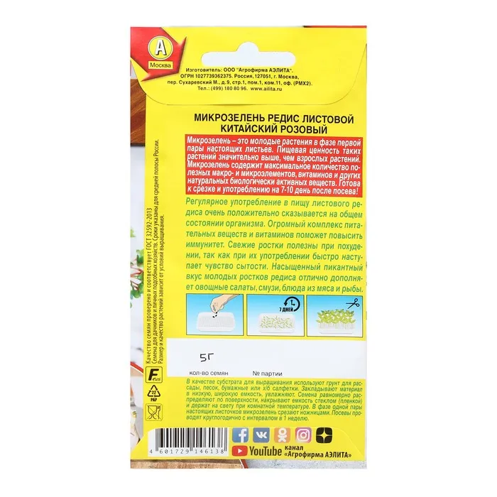 Микрозелень – это молодые растения в фазе первой пары настоящих листьев. Пищевая ценность таких растений значительно выше, чем взрослых растений. Микрозелень содержит максимальное количество полезных макро- и микроэлементов, витаминов и других натуральных биологически активных веществ. Готова к срезке и употреблению на 7-10 день после посева.