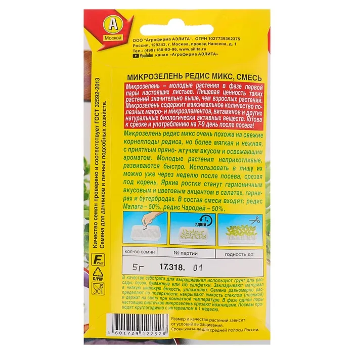 Выращивается круглый год. Для получения микрозелени можно использовать низкие широкие ёмкости. Заполните выбранный сосуд стерильным субстратом для выращивания рассады или комнатных растений. Распределите семена по поверхности с промежутками около 0,5 см и присыпьте слоем субстрата 0,3–0,5 см. Хорошо увлажните из опрыскивателя.