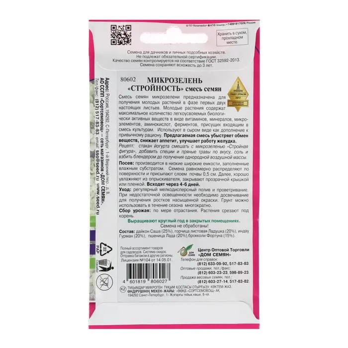 Состав: дайкон Саша (25%), горчица листовая Ладушка (20%), индау Гурман (20%), пшеница Лада (20%),брокколи Фортуна (15%)