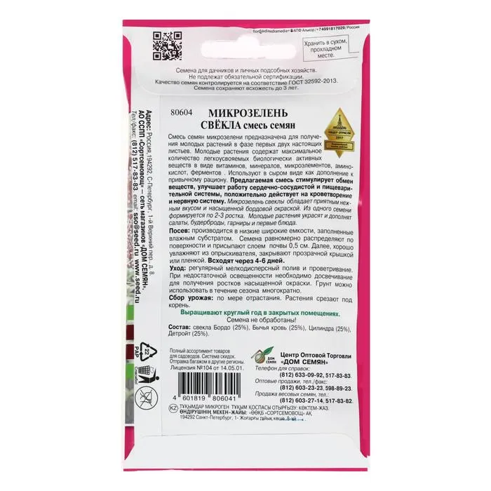 Смесь семян «микрозелень» предназначена для получения молодых растений в фазе первых двух настоящих листьев. Молодые растения содержат максимальное количество легкоусвояемых биологически активных веществ в виде витаминов, минералов, микроэлементов, аминокислот, ферментов, присущих свекле. Используют в сыром виде как дополнение к привычному рациону. Предлагаемая смесь стимулирует обмен веществ, улучшает работу сердечно-сосудистой и пищеварительной системы, положительно действует на кроветворение и нервную систему. Микрозелень свеклы обладает приятным нежным вкусом и насыщенной бордовой окраской. Из одного семени формируется по 2-3 ростка. Молодые растения украсят и дополнят салаты, будерброды, гарниры и первые блюда.