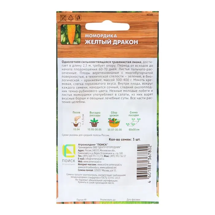 Однолетняя сильноветвящаяся травянистая лиана, достигает в длину 2,5 м, требует опору. Период от всходов до начала плодоношения 60-70 дней. Листья пальчато-рассеченные. Плоды веретеновидные с многобугорчатой поверхностью, в технической спелости - зеленые, в биологической - оранжевые, массой 300 400 г. Мякоть кремовая, слегка горьковатого вкуса. Внутри плода, вокруг каждого семени, находится сочный, сладкий околоплодник темно-рубинового цвета. Нежные молодые побеги и листья момордики употребляют в салаты, из них варят вкусные борщи и овощные лечебные супы. Все части растения целебны.